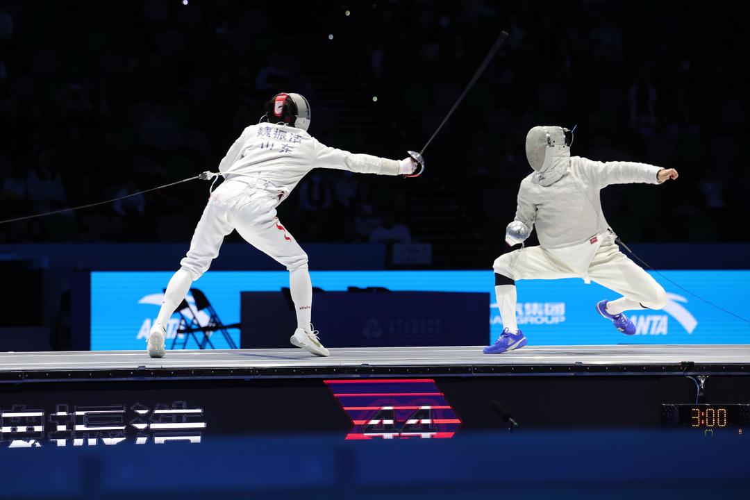 9個回合比賽,最后一回合由魏振浩對戰鄧小浩——本屆全運會佩劍個人冠軍對戰上屆全運會佩劍個人冠軍,比賽打得驚心動魄。戰場所有人的心都提到了嗓子眼,40:38,41:40,42:41,44:43……中間魏振浩還在一輪攻防后因慣性和腿部拉傷倒地,裁判呼叫賽場醫生進行查看和簡單處理后方才恢復比賽。最后一輪攻防,魏振浩以靜制動,防守后迅捷反擊,45:43,拿下制勝一分。